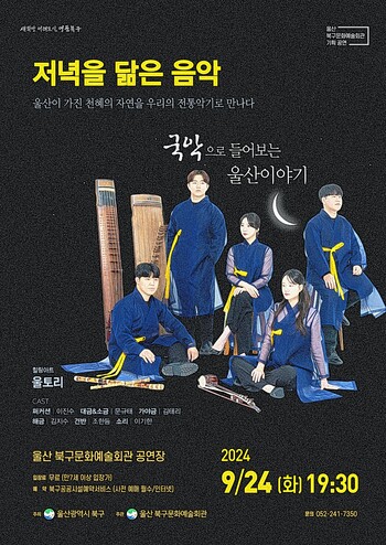 울산북구문화예술회관은 저녁을 닮은 음악 9월 공연으로 오는 24일 오후 7시 30분 지역 청년 예술단체 울토리의 공연 '국악으로 들어보는 울산이야기'를 선보인다.
